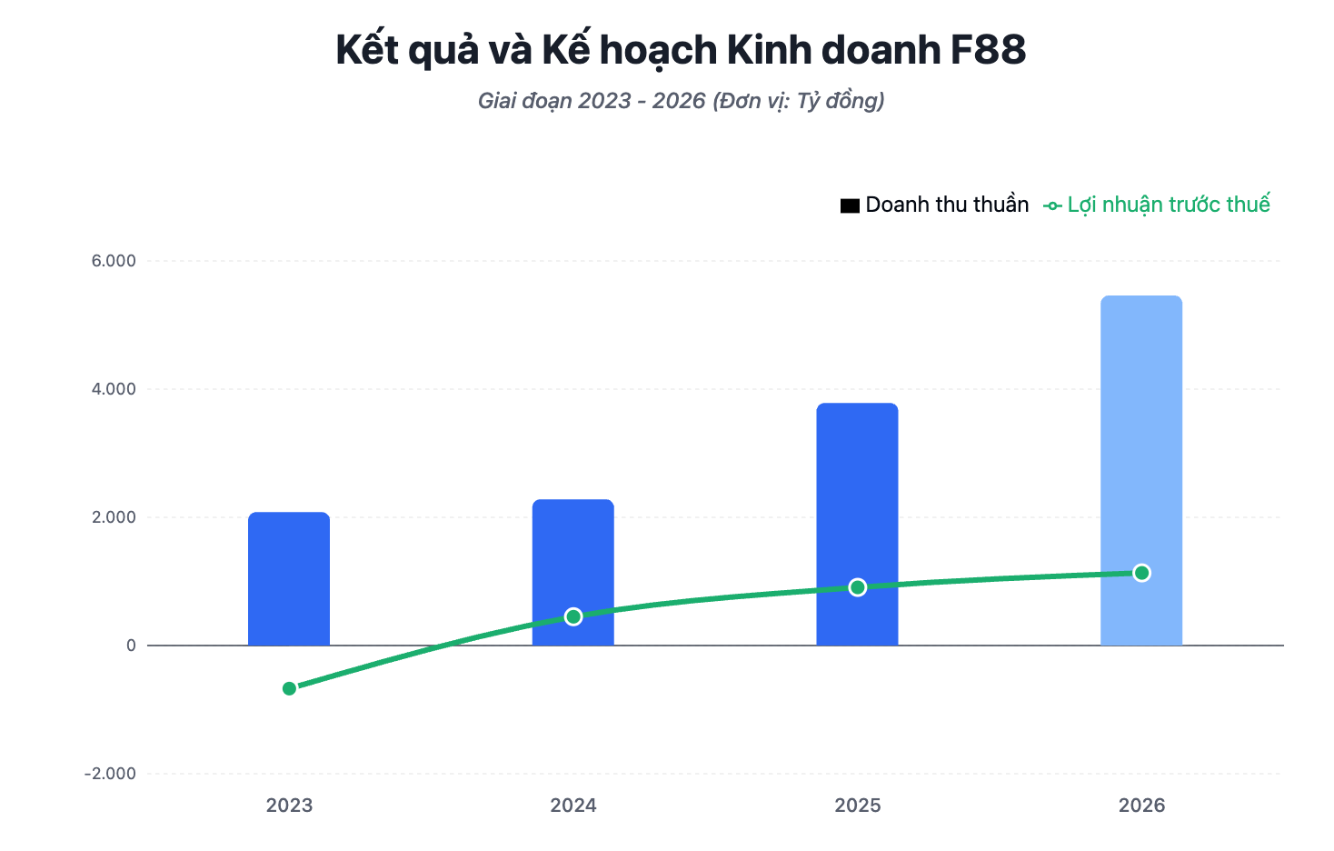 Năm 2026, F88 đặt kế hoạch doanh thu bán hàng và cung cấp dịch vụ đạt hơn 5.461 tỷ đồng, tăng 42% so với năm 2025. Dư nợ (Net Loan Book) dự kiến hơn 7.501 tỷ đồng, tăng 33%. Lợi nhuận trước thuế hợp nhất mục tiêu đạt 1.133 tỷ đồng, tăng 25%.